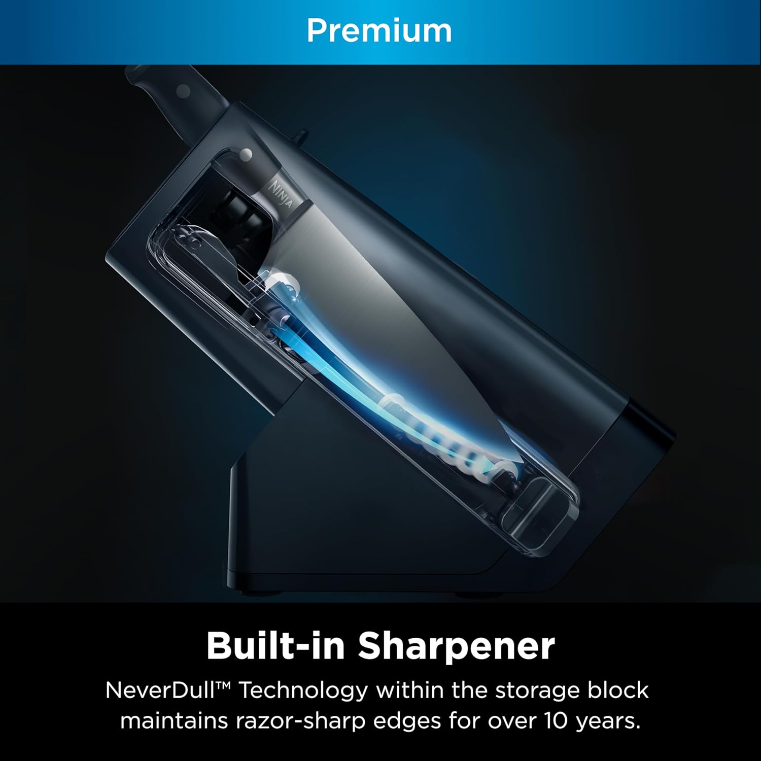 - BUILT IN SHARPENER: NeverDull Technology is conveniently built into the storage block for professional sharpening results that will maintain a razor sharp edge for over 10 years